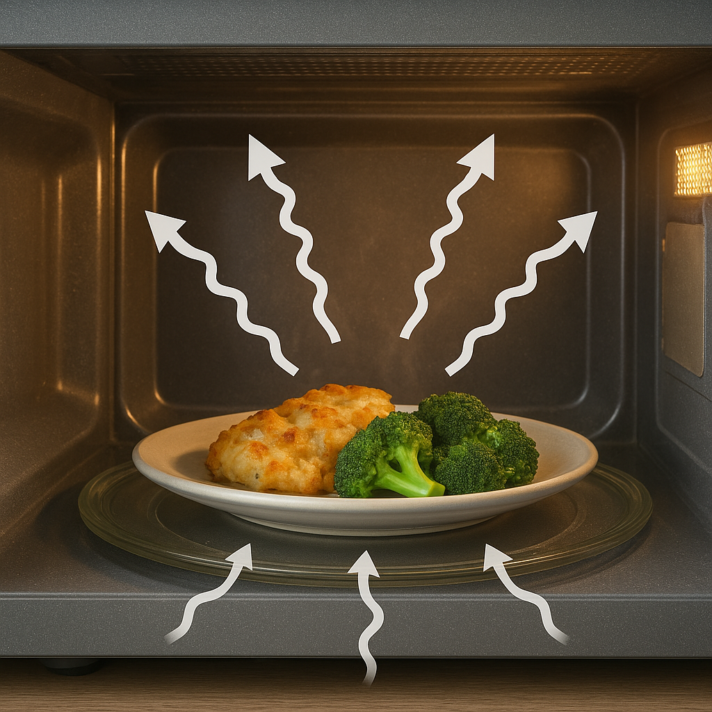 Podstawowym procesem odpowiedzialnym za podgrzewanie żywności w mikrofalówce jest zjawisko nagrzewania dielektrycznego. Polega ono na absorpcji energii elektromagnetycznej przez substancje o cząsteczkach posiadających dipol lub ładunek. Woda, tłuszcze i niektóre składniki pokarmowe zawierają polaryzowalne cząsteczki, które pod wpływem zmiennego pola elektromagnetycznego zaczynają wykonywać intensywne drganie. W wyniku tarcia wewnętrznego następuje przemiana tej energii na ciepło, co skutkuje szybkim podgrzaniem produktu.